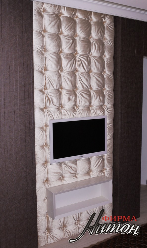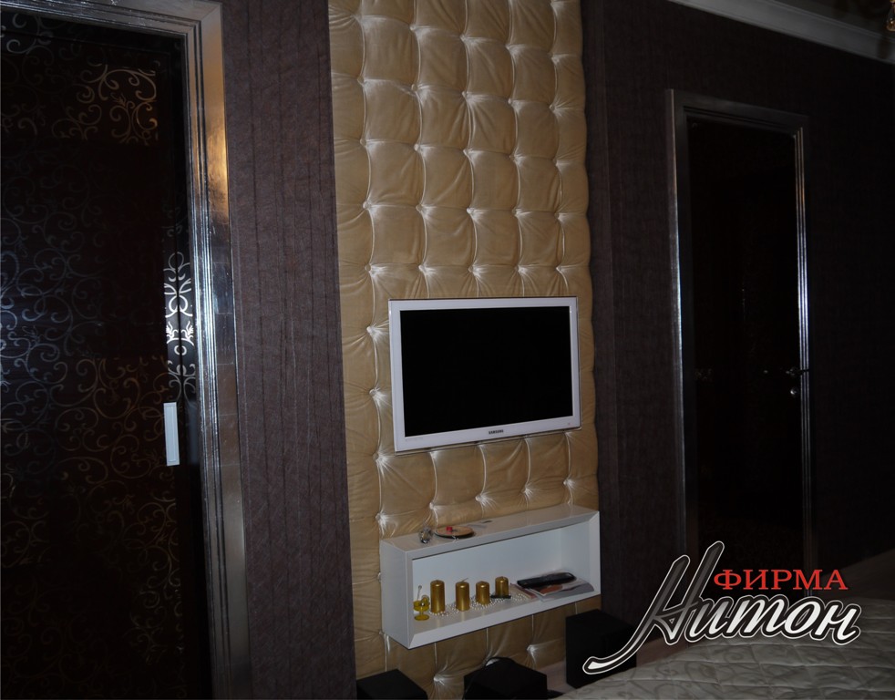Комплект панелей представляющий собой композицию стены для спальни в общей дизайнерской концепции. Одна панель представляет собой декоративную накладку на откатную дверь в гардеробную, вторая закрывает нишу со встроенным телевизором, третья поддерживает общий дизайн комнаты и представляет декоративную накладку на стену.