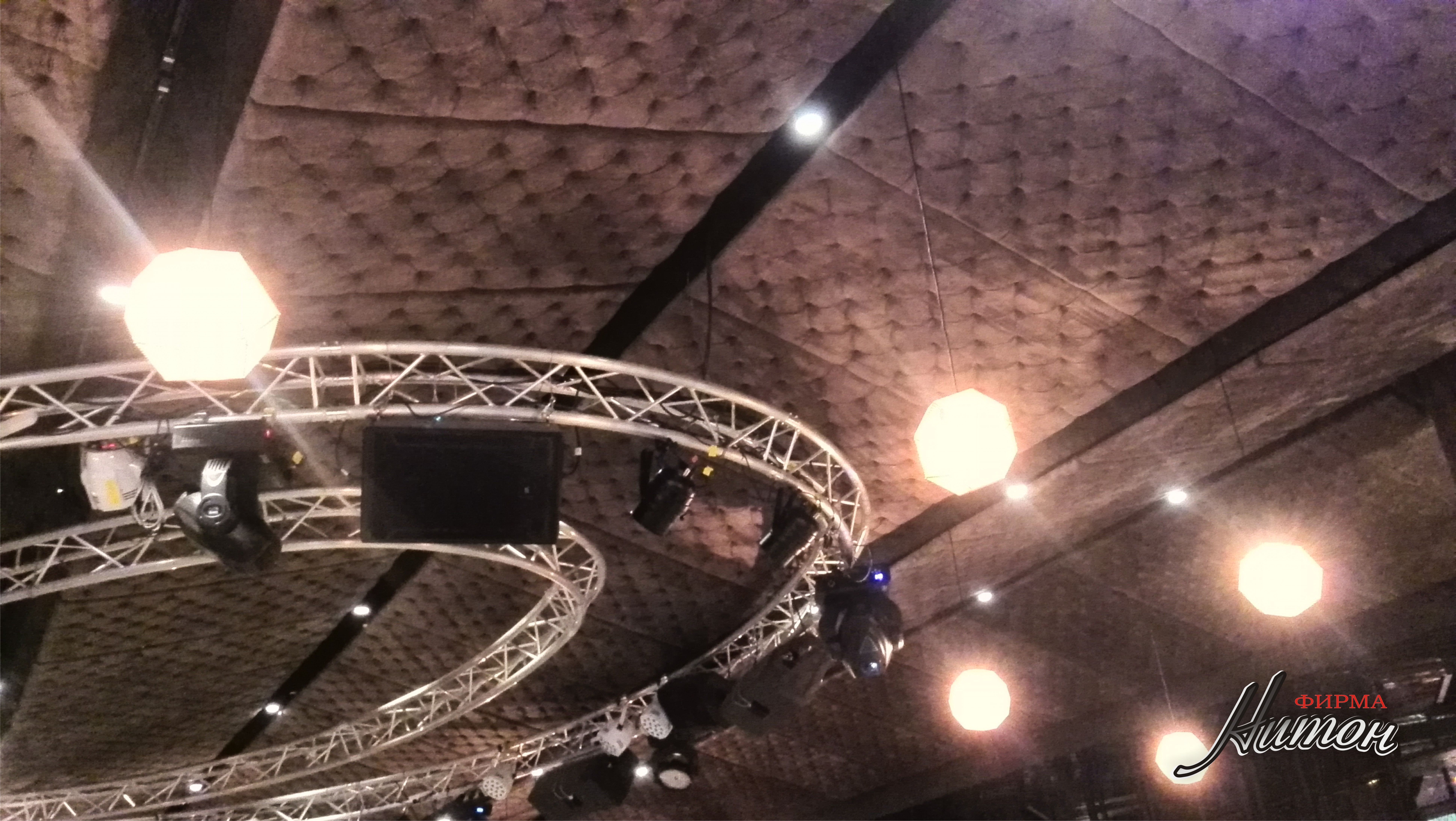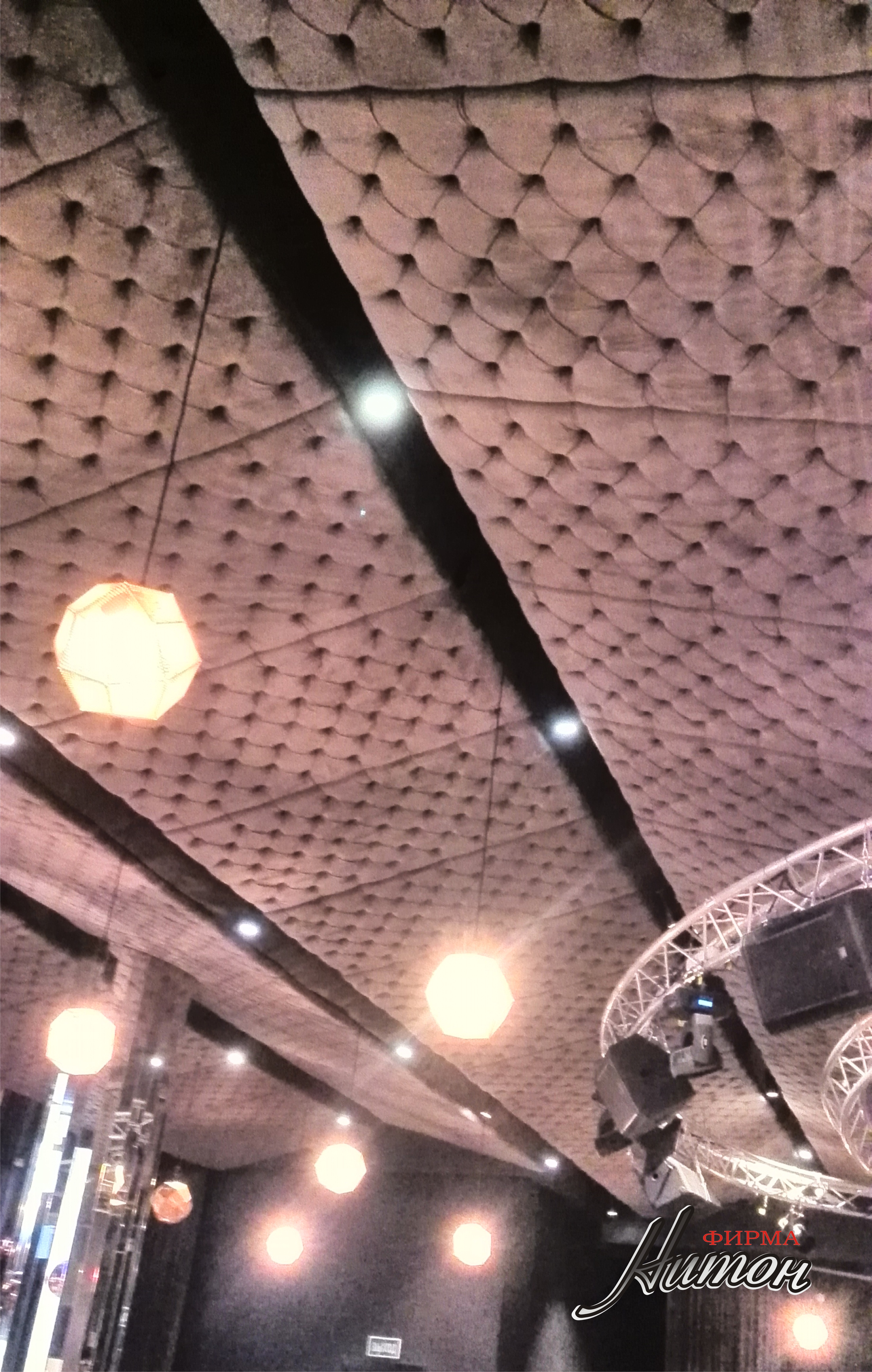 Комплект потолочных панелей для звукоизоляции. Изготовлены для ресторана в комплексе "Журавинка" г. Минска. Крепится на подвесных конструкциях с подвесным освещением. В данном случае каретная стяжка выполняет функцию гашения звуковых волн, что является очень эффективной звукоизоляцией даже для очень больших помещений.