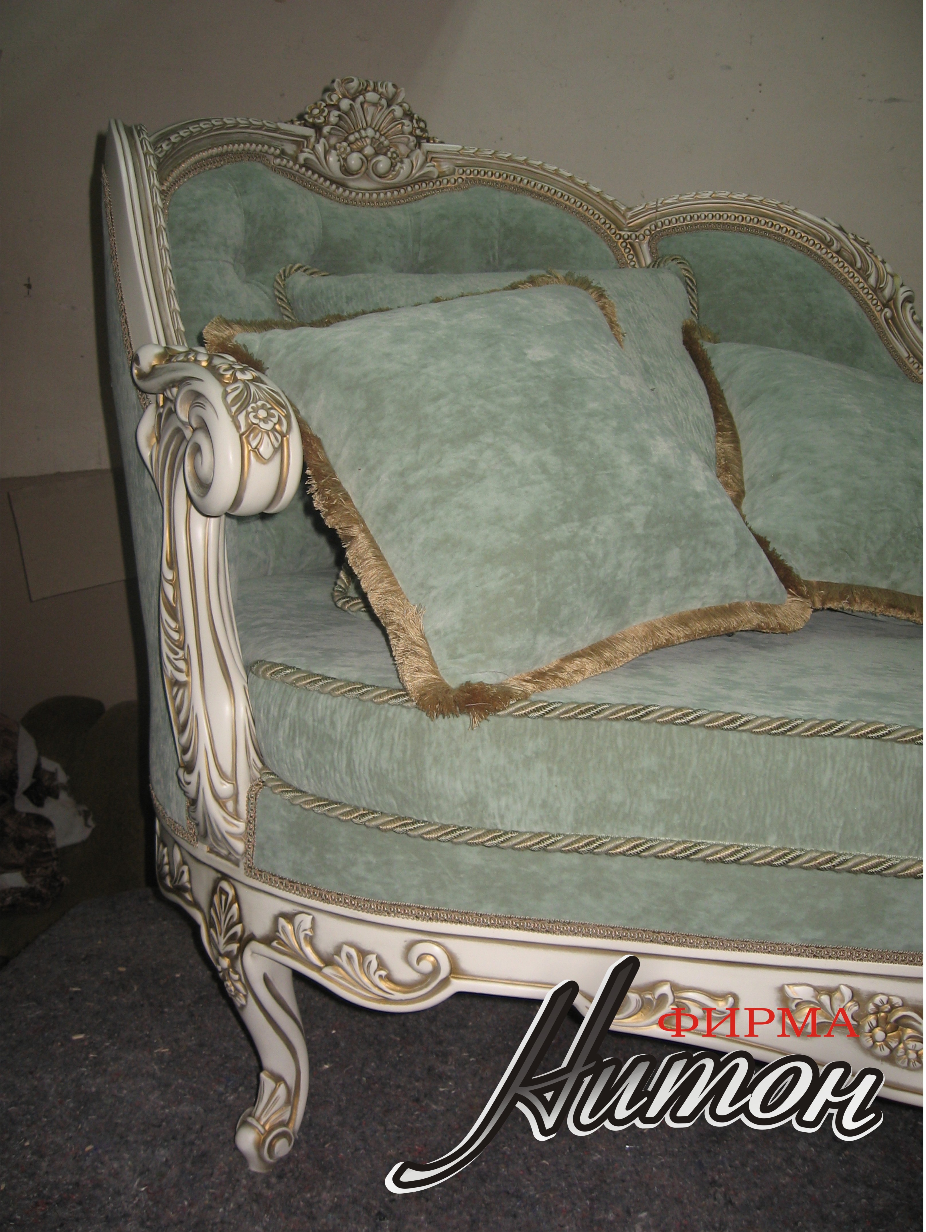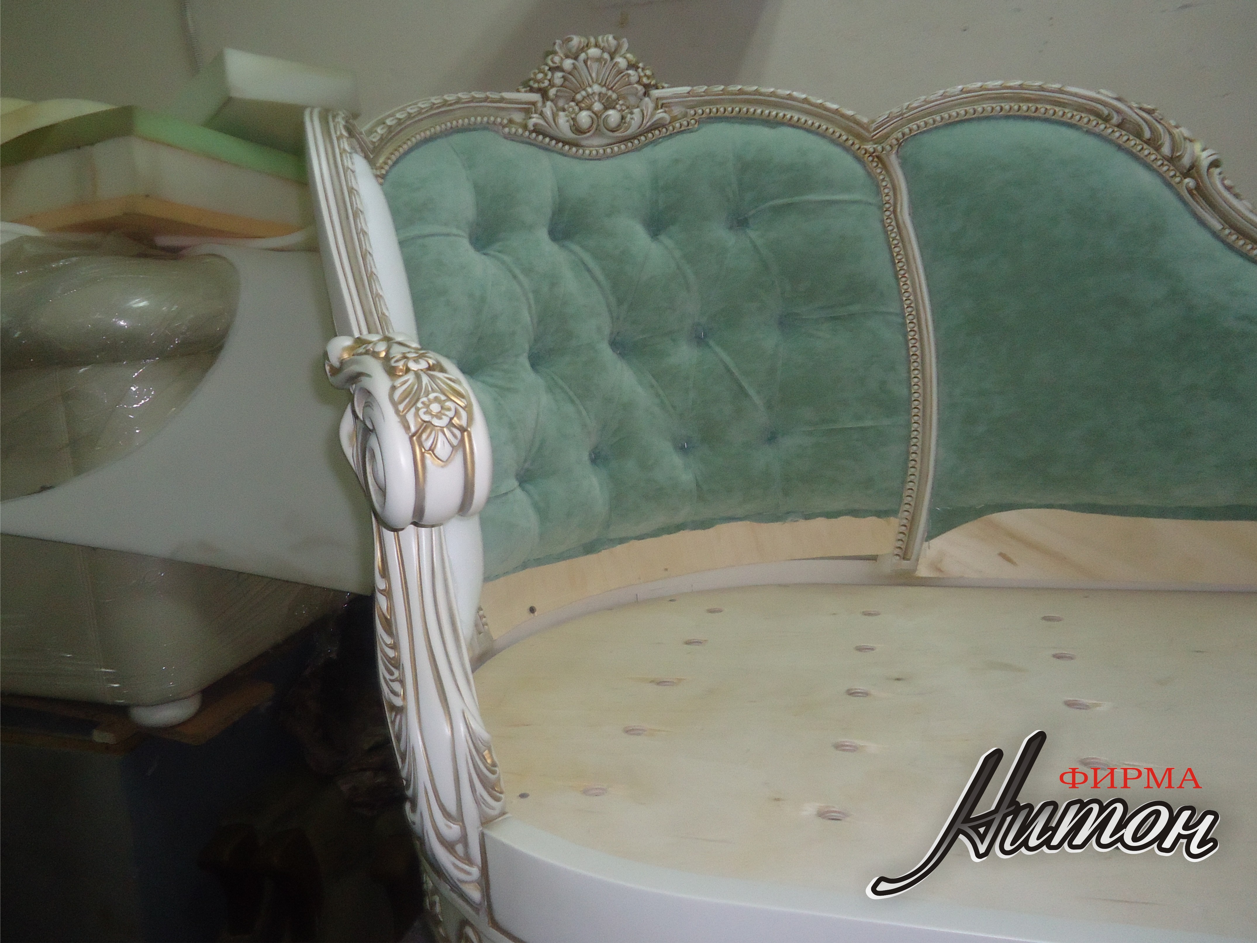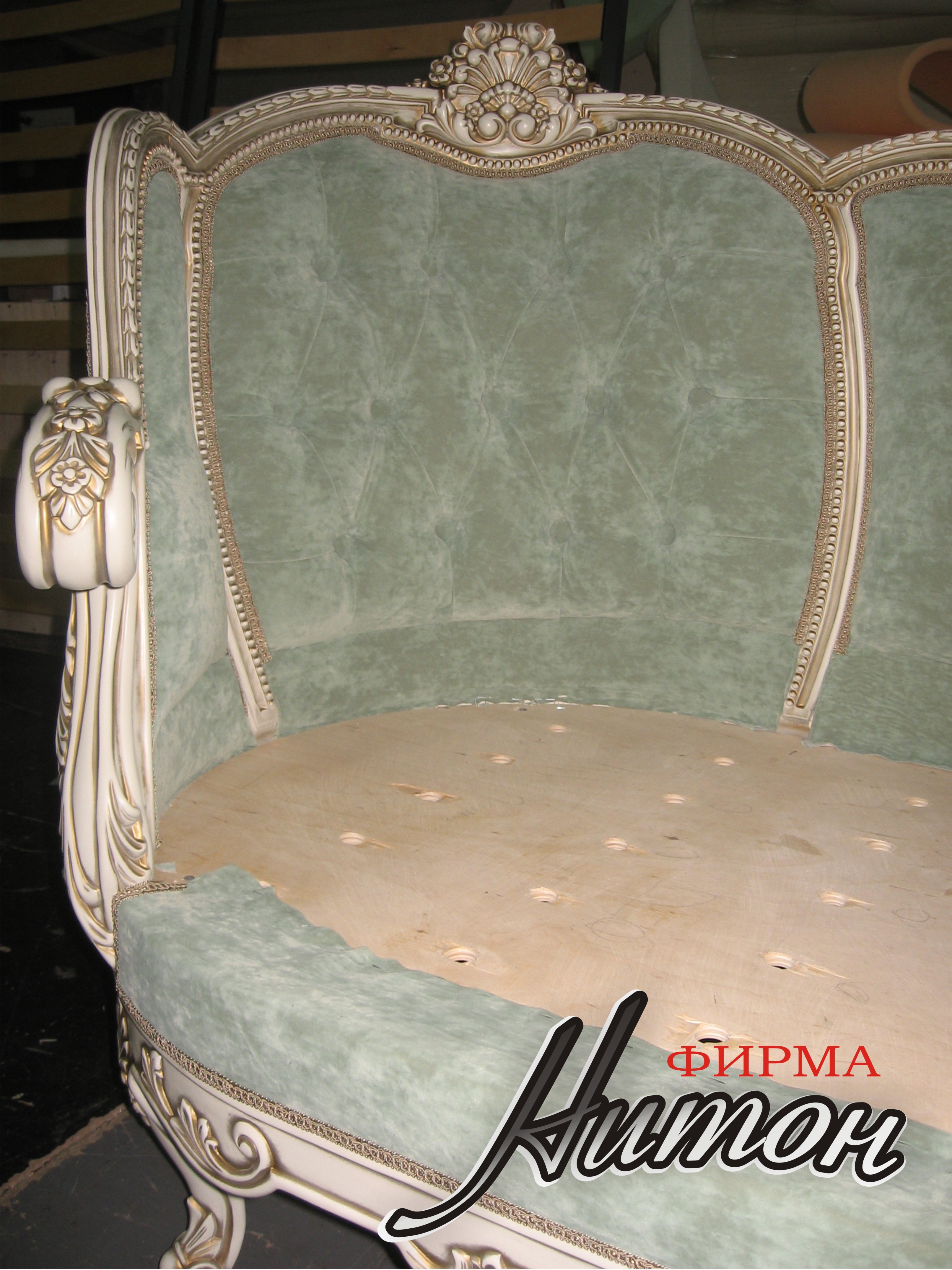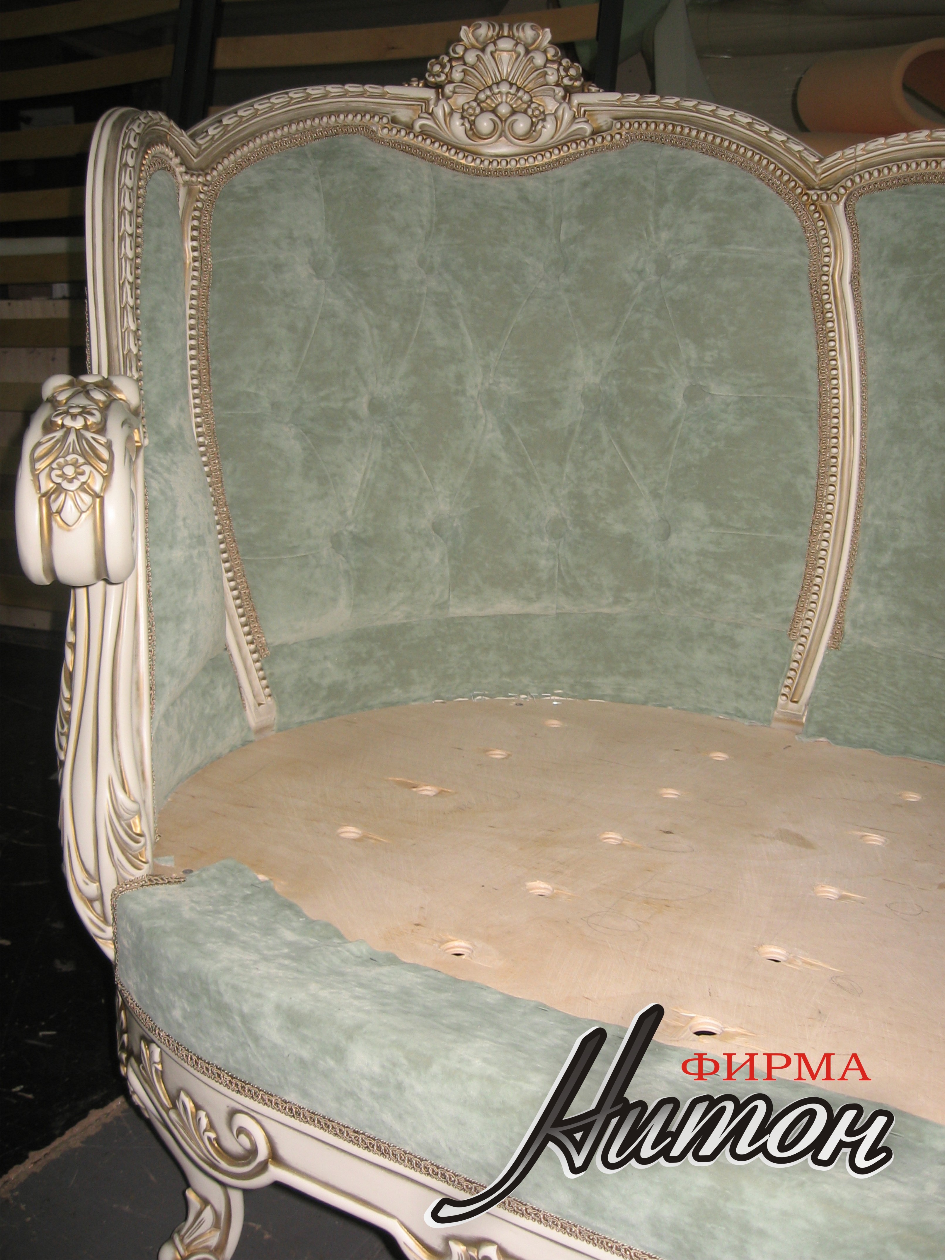 Софа в классическом стиле - результат совместной работы с ПК "Гарант-100". Выполнена по эскизу Заказчика. Каркас софы и элементы резьбы изготовлены мастерами ПК "Гарант-100". В мастерской ООО "Нитон" изготовлены мягкие элементы (наполнитель независимы пружинный блок и высокоэластичный поролон марки HR),выполнена обивка и отделка декоративными элементам: тесьма, кант, декоративные пуговицы. Изготовлены декоративные подушки. Сочетание нескольких тканей и способов обивки (пиковка, утяжка, присадка) делают изделие неповторимым. Точно такого же не будет никогда.