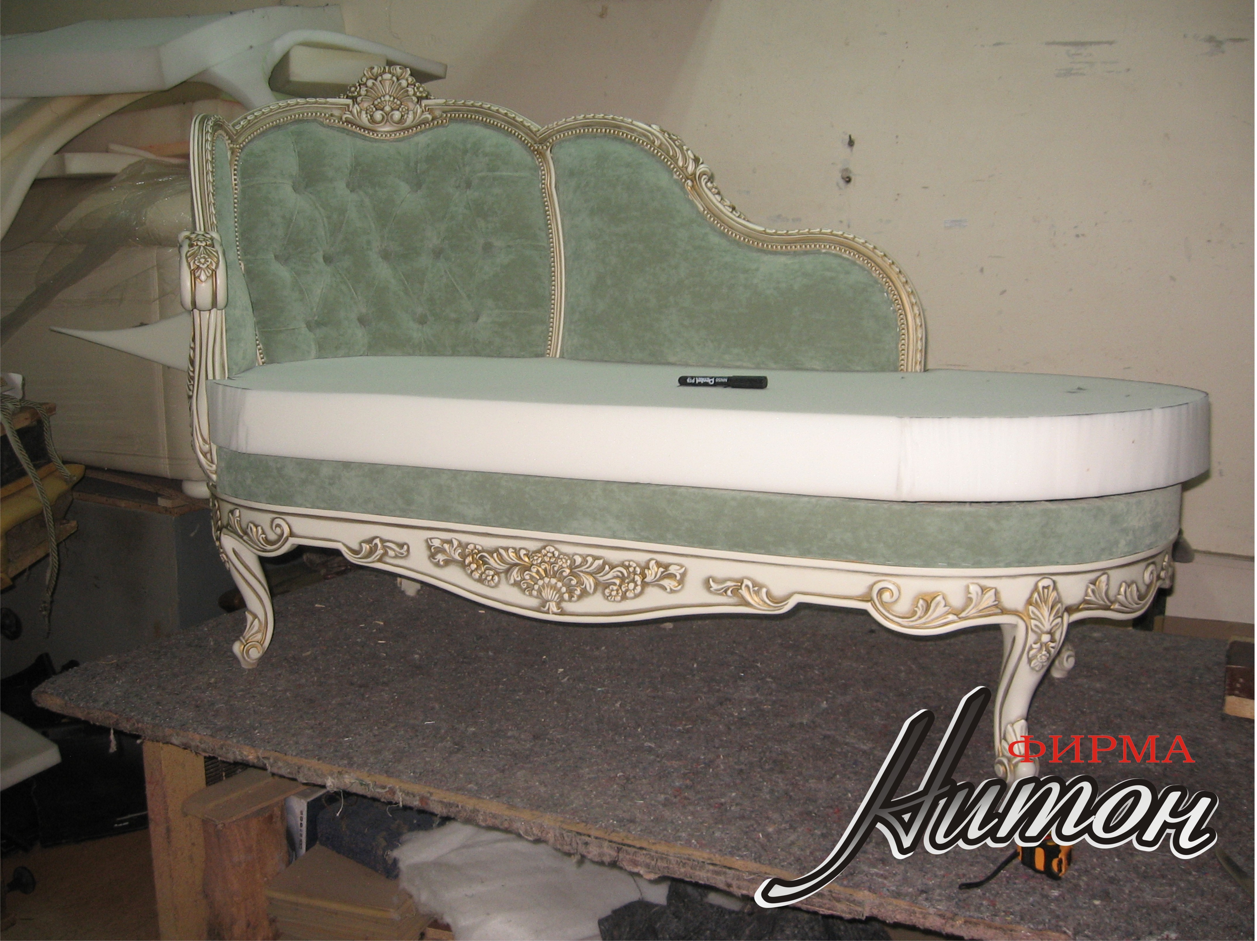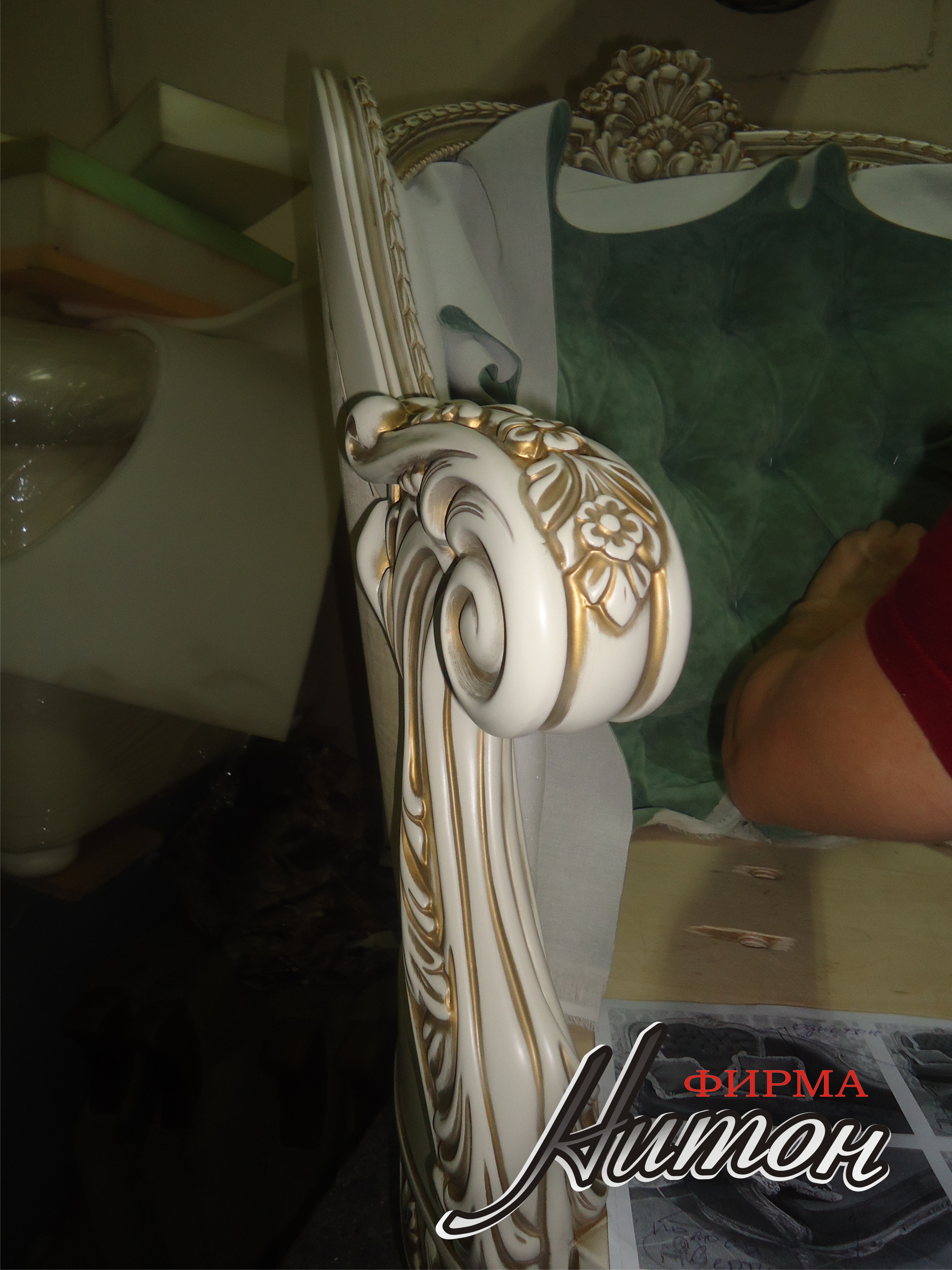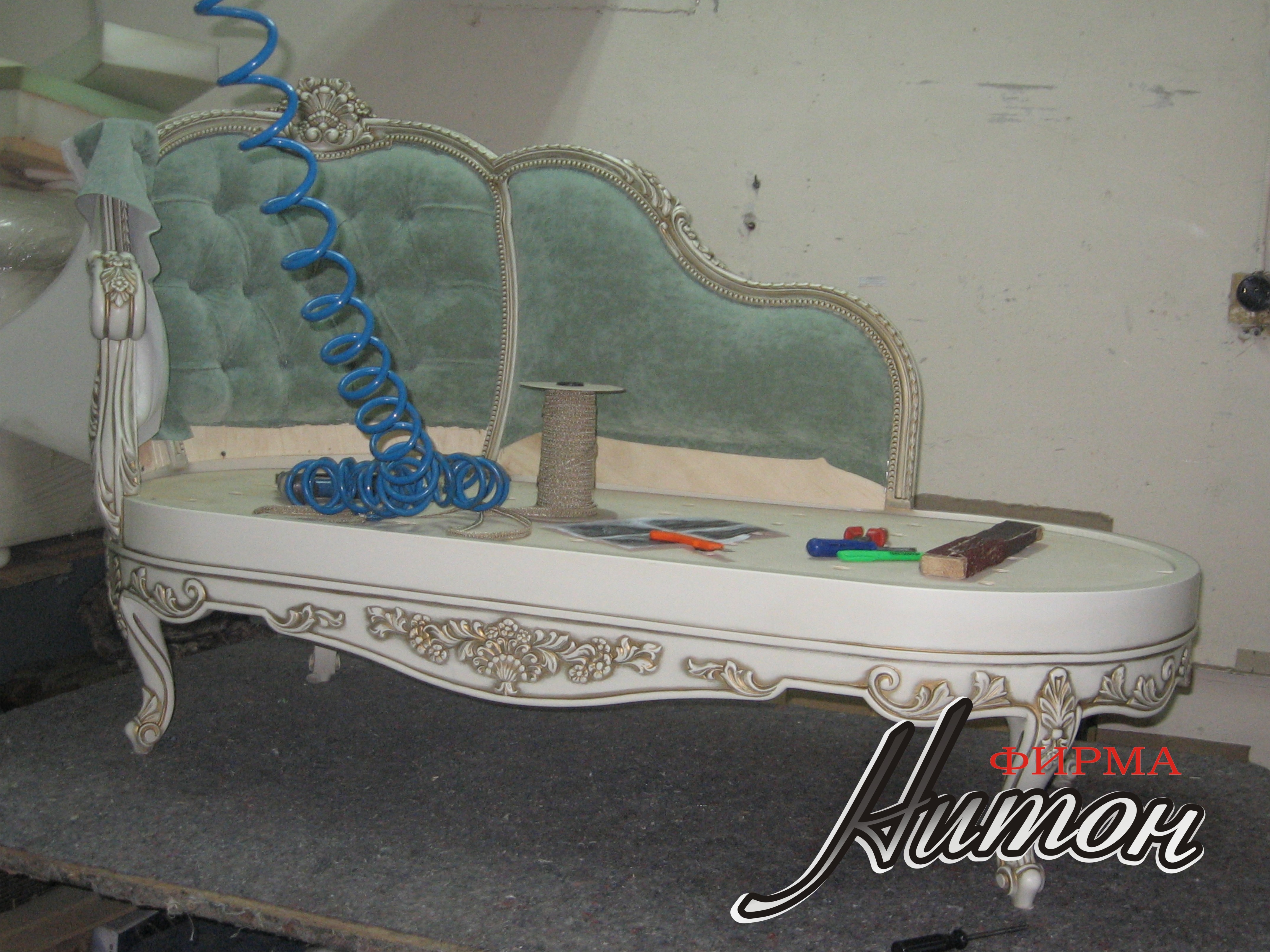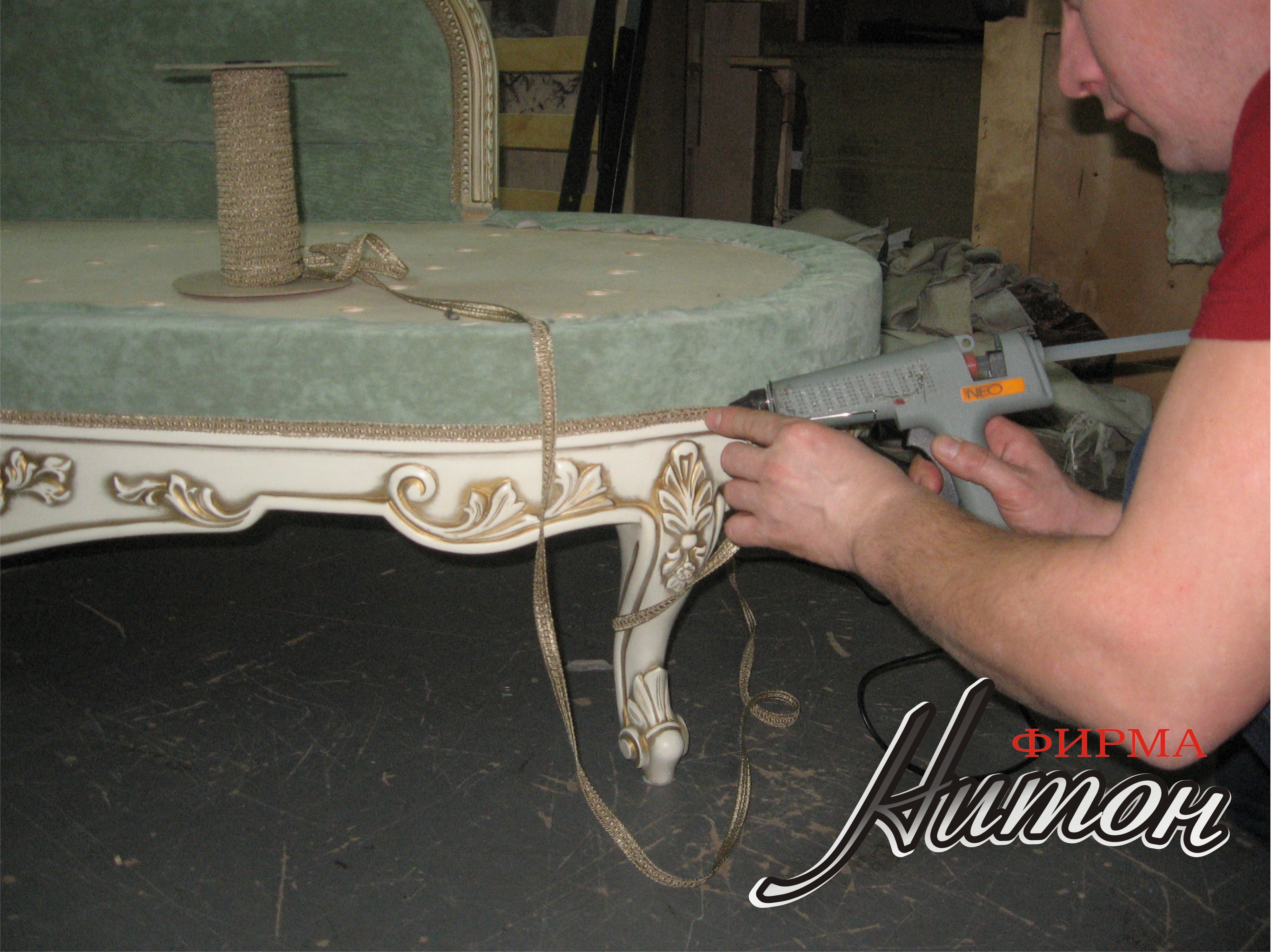Софа в классическом стиле - результат совместной работы с ПК "Гарант-100". Выполнена по эскизу Заказчика. Каркас софы и элементы резьбы изготовлены мастерами ПК "Гарант-100". В мастерской ООО "Нитон" изготовлены мягкие элементы (наполнитель независимы пружинный блок и высокоэластичный поролон марки HR),выполнена обивка и отделка декоративными элементам: тесьма, кант, декоративные пуговицы. Изготовлены декоративные подушки. Сочетание нескольких тканей и способов обивки (пиковка, утяжка, присадка) делают изделие неповторимым. Точно такого же не будет никогда.