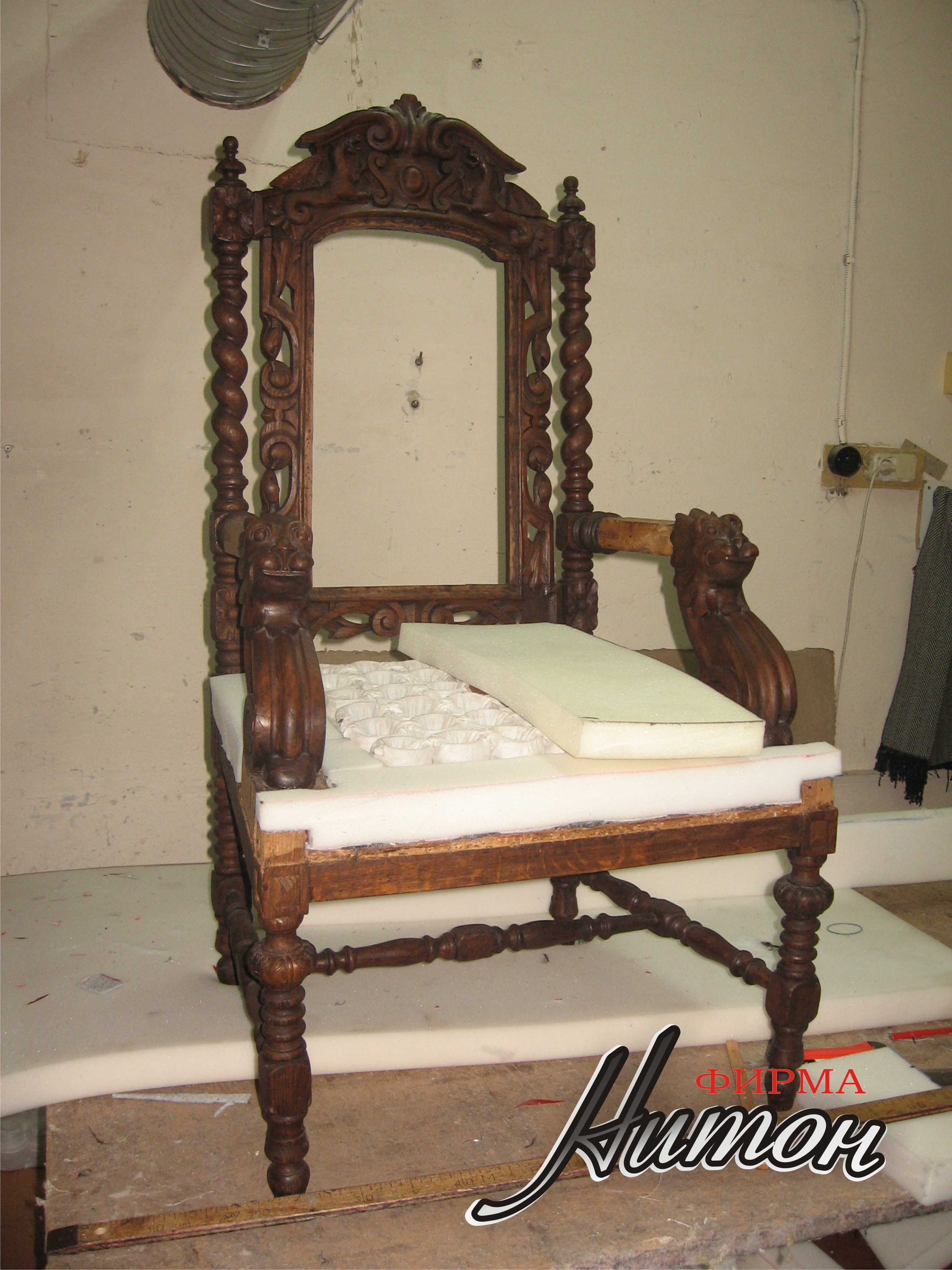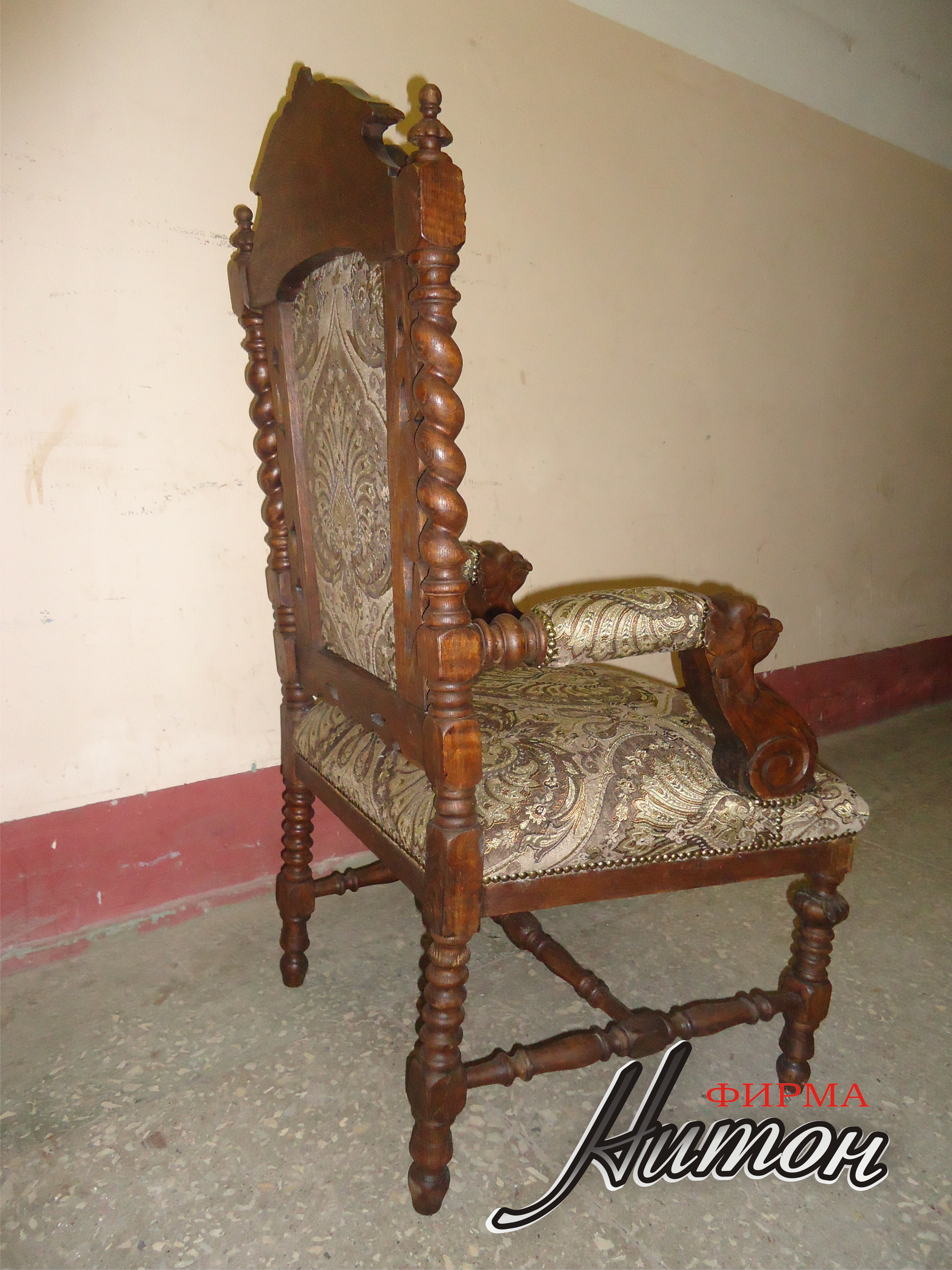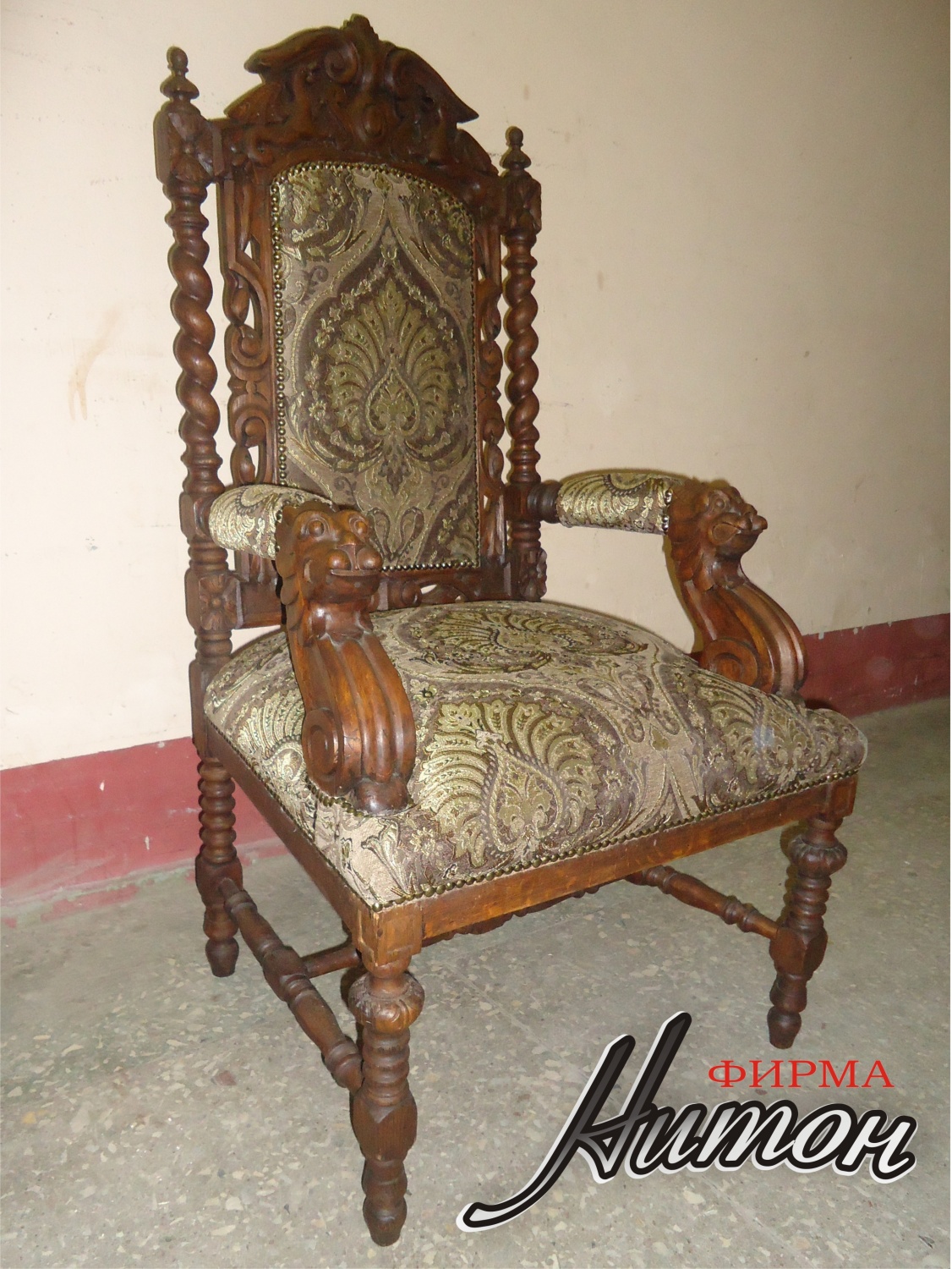 Кресло попало в нашу мебельную мастерскую после реставрации каркаса. С согласия Заказчика к восстановлению мягких элементов подошли не совсем аутентично. Вместо отсутствующих пружин и настила из конского волоса были изготовлены мягкие элементы из современных материалов: независимый пружинный блок и высокоэластичный поролон марки HR. Тканевая обивка была восстановлена согласно старых отметин на каркасе и найденных в интернете фотографий аналогичных кресел. Для финишной отделки использована имитация гвоздей (декоративная шинка).Для обивки был использован гобелен бельгийского производства.