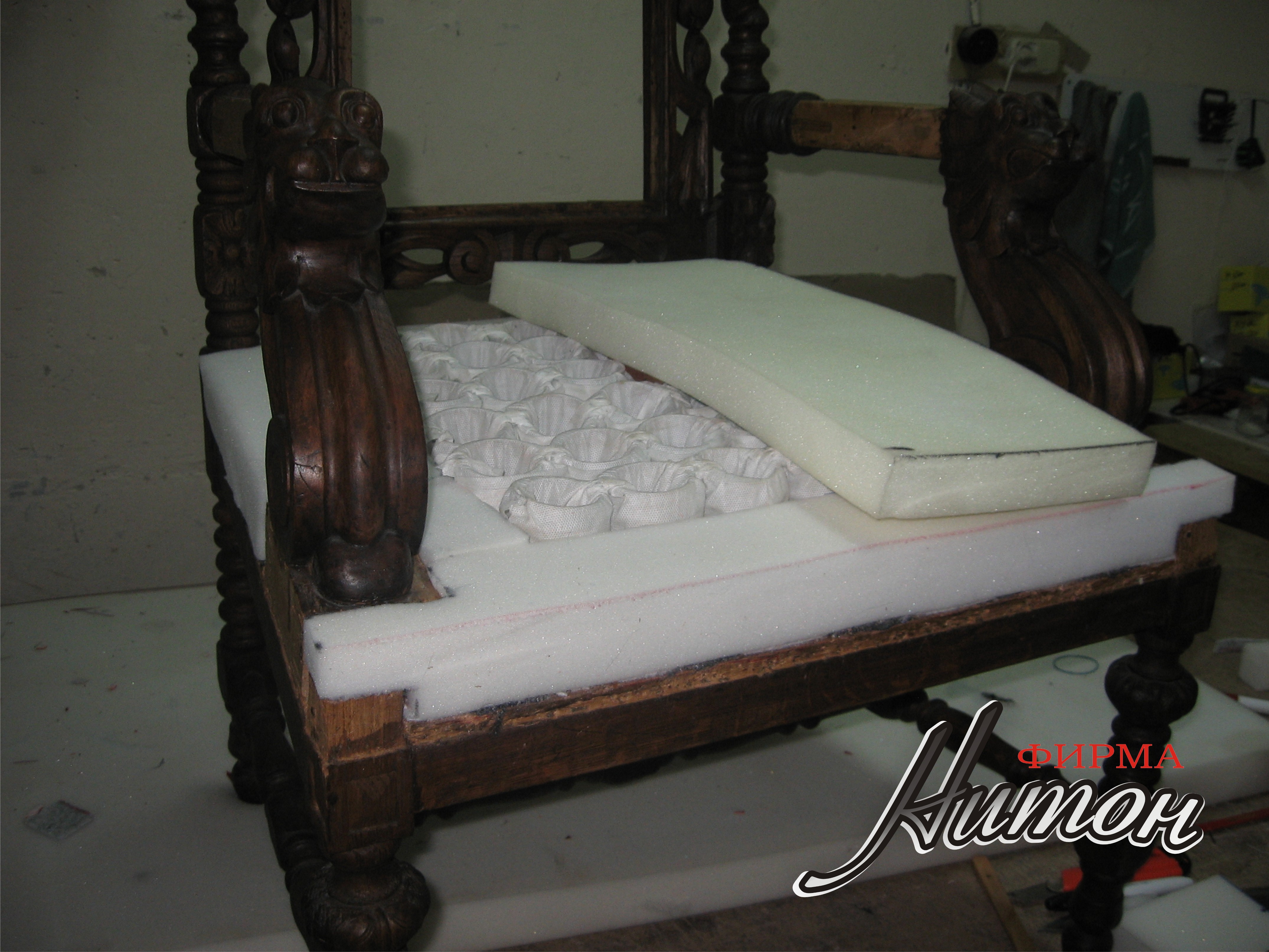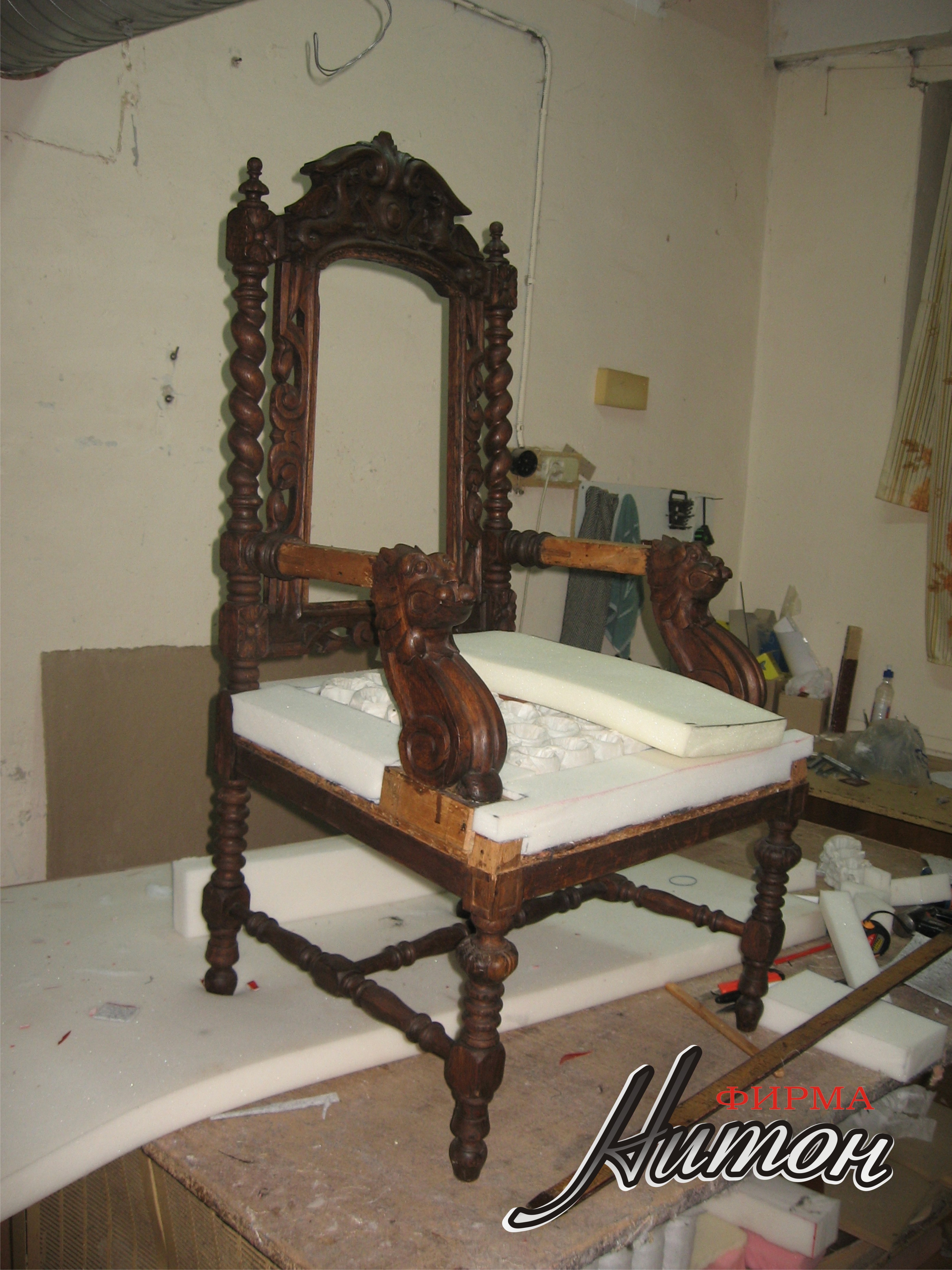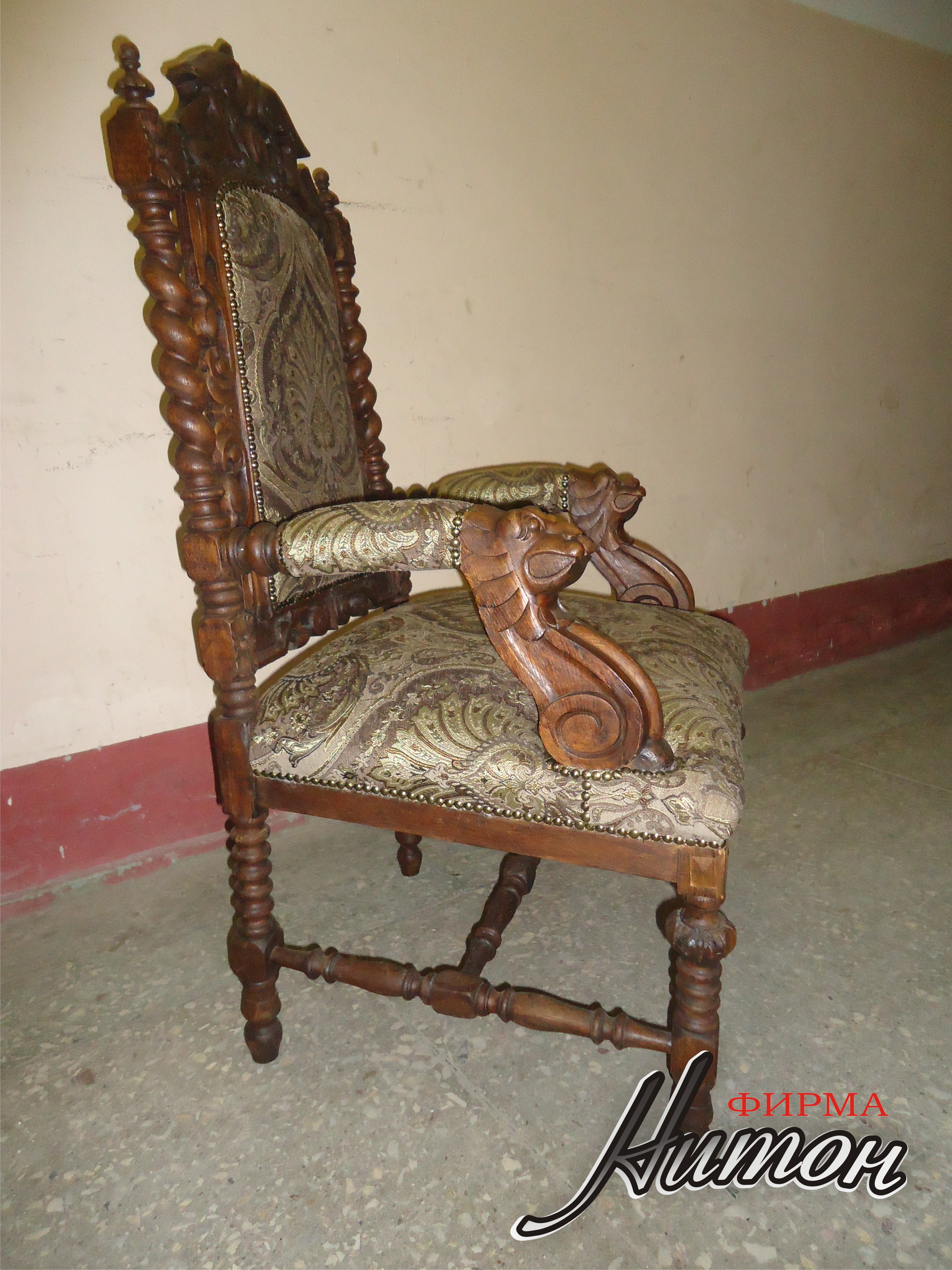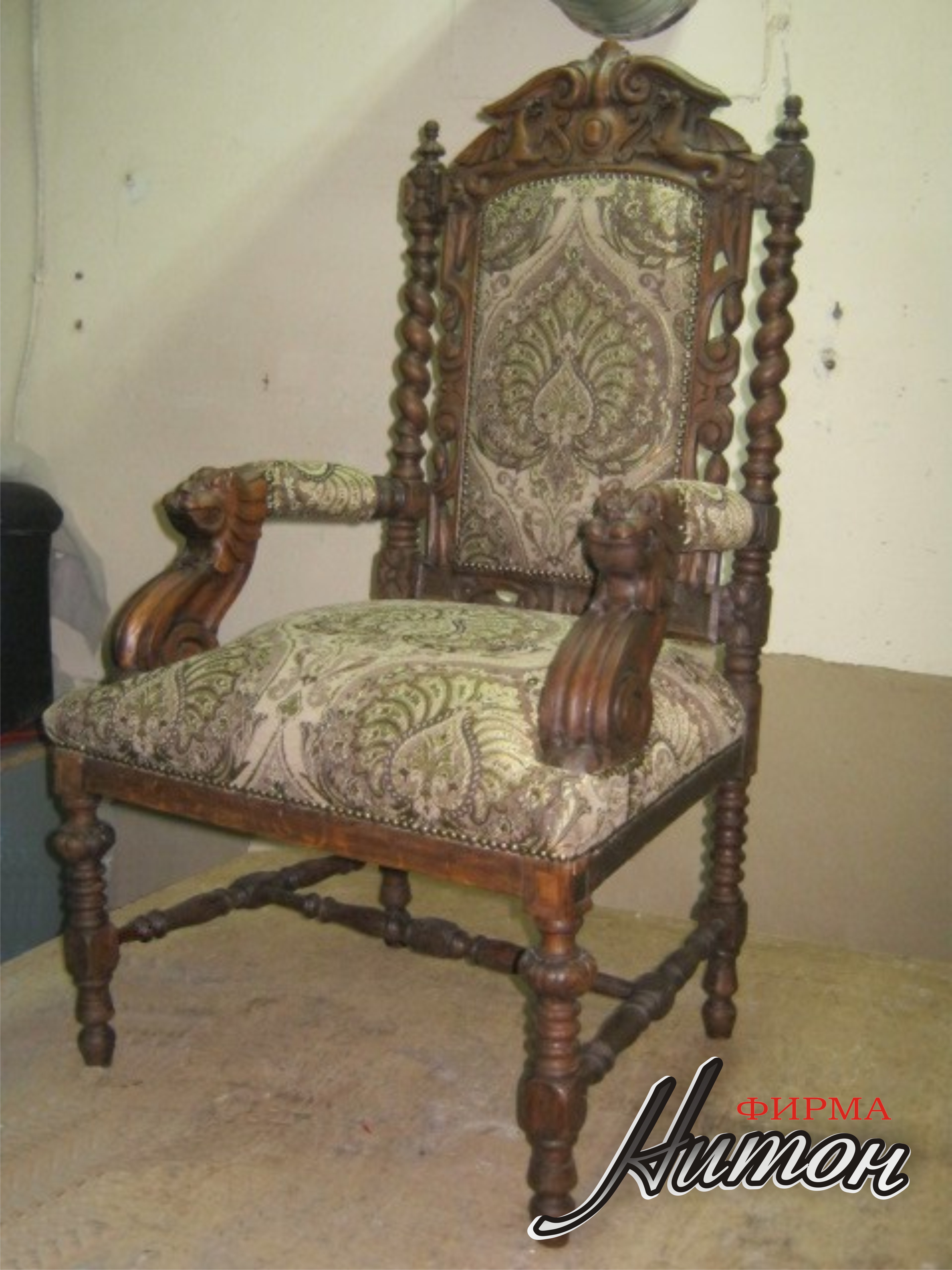 Кресло попало в нашу мебельную мастерскую после реставрации каркаса. С согласия Заказчика к восстановлению мягких элементов подошли не совсем аутентично. Вместо отсутствующих пружин и настила из конского волоса были изготовлены мягкие элементы из современных материалов: независимый пружинный блок и высокоэластичный поролон марки HR. Тканевая обивка была восстановлена согласно старых отметин на каркасе и найденных в интернете фотографий аналогичных кресел. Для финишной отделки использована имитация гвоздей (декоративная шинка).Для обивки был использован гобелен бельгийского производства.